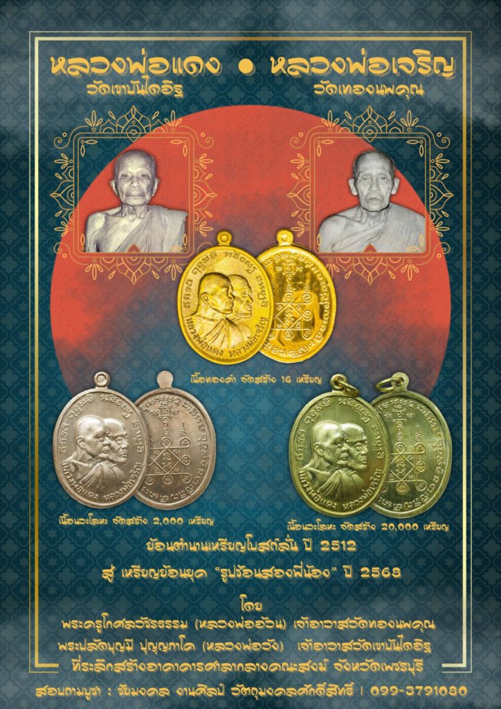 ปี พ.ศ.2512 หลวงพ่อเจริญ ท่านต้องการหาปัจจัยไปซ่อมและสร้างถาวรวัตถุใน วัดทองนพคุณ ท่านจึงได้นำความไปปรึกษา หลวงพ่อแดง พี่ชายของท่าน และนั่นจึงเป็นที่มาของการสร้าง เหรียญหน้าซ้อน (เหรียญสองพี่น้อง) เมื่อสร้างเหรีญแล้วนำท่านจึงนำไปให้ หลวงพ่อแดง ปลุกเสกก่อน 1 พรรษา ภายหลังจึงจัดทำพิธีพุทธาภิเษกขึ้นที่ วัดทองนพคุณ