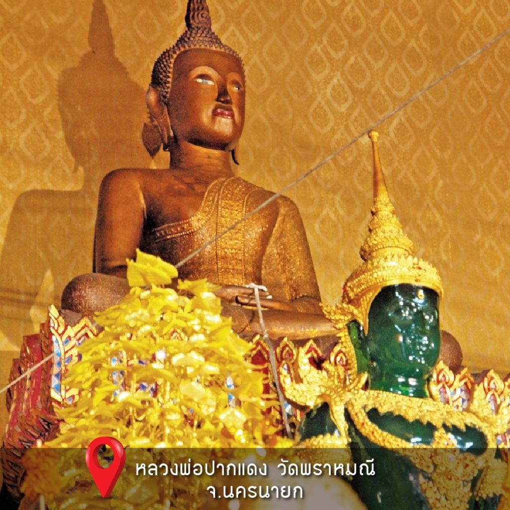 หลวงพ่อปากแดง วัดพราหมณี ต.บ้านใหญ่ อ.เมือง นครนายก พระพุทธรูปสัมฤทธิ์ศักดิ์สิทธิ์องค์หนึ่งของจังหวัดนครนายก ที่ชาวบ้านให้ความเลื่อมใส และศรัทธา โดยจะนำเอา กล้วยน้ำหว้า, หมากพลู, พวงมาลัย และน้ำแดง มาถวายกันจนแน่นพระอุโบสถ ด้วยล่ำลือกันว่า หลวงพ่อปากแดง ท่านมีเมตตามาก มีลาภมาก ศักดิ์สิทธิ์ให้หวยแม่น จนมีเป็นที่รู้จักกันอย่างกว้างขวาง มีชาวบ้านจากทั่วทุกสารทิศต่างแห่กันไปกราบไหว้ขอพร เสริมดวง เสริมโชค และขอเลขเด็ดจาก น้ำตาเทียนในอ่างน้ำมนต์ หรือเขย่าเซียมซี หน้าวิหารหลวงพ่อปากแดง เป็นจำนวนมาก ยิ่งช่วงใกล้วันหวยออกนี้เรียกได้มากันมากจนที่จอดรถในวัดไม่พอให้จอดตั้งแต่เช้ามืดจนเย็นค่ำ เรียกว่ามากันล้นวัด จากประสบการณ์มากมายจากนักท่องเที่ยวและประชาชนทั่วไปที่ได้เคยเดินทางมากราบสักการะหลวงพ่อปากแดง และซื้อลอตเตอรี่จากแผงขายในวัด เพื่อเป็นการเสี่ยงโชค
