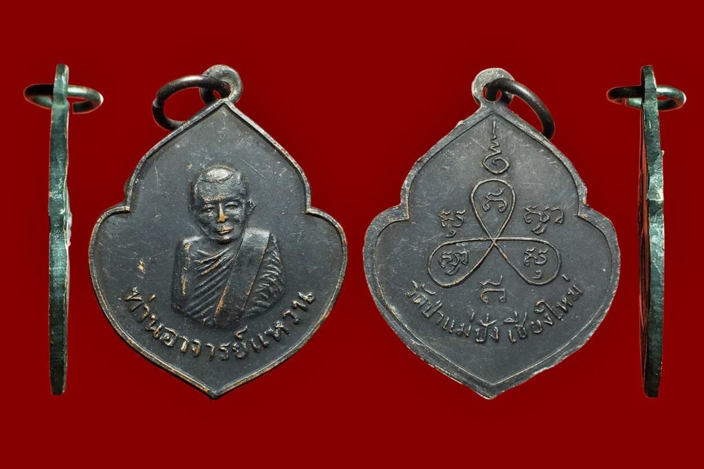 ลักษณะเด่นเป็นเหรียญหน้าวัว ด้านหน้า – เหรียญสลักว่า “ท่านอาจารย์แหวน” ด้านหลัง – เหรียญจารยันต์ และสลักว่า “วัดป่าแม่ปั๋ง เชียงใหม่” เป็นเหรียญหลวงปู่แหวน รุ่นที่ 1 ที่มีจำนวนการสร้างจำนวนน้อยมาก เนื้อเงิน 10 เหรียญ และเนื้อทองแดงประมาณ 1,000 เหรียญ ปัจจุบันจัดว่าเป็นรุ่นหายากยิ่ง แต่ในวงการพระยังคงนิยมตามหากัน จึงทำให้ราคาเหรียญหลวงปู่แหวน รุ่นแรก หน้าวัว ปี 2513 มูลค่าสูงมาก