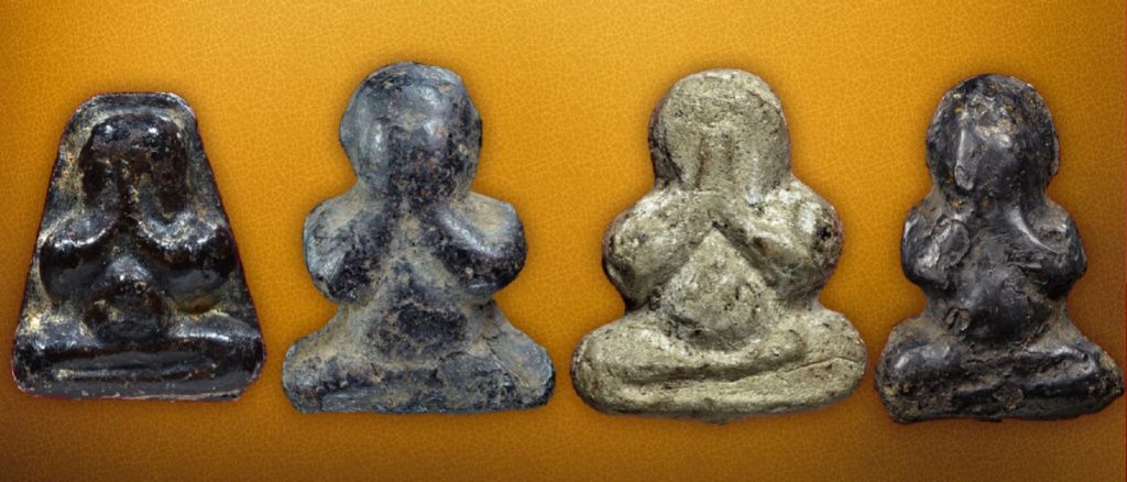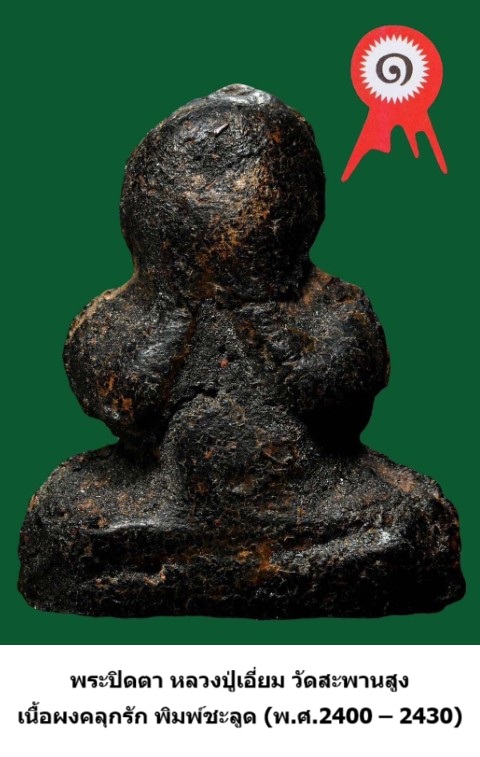 The Phra Pidta is considered one of the five best Phra Pidta, which is Luang Pu Eiam’s Phra Pidta from Wat Saphan Sung. It is made from valuable materials and goes through a sacred and powerful ritual. He will use sacred herb powder and roots, which are believed to be very charming, and grind them together with Phathamang powder, Itthije powder, Trinisinghe powder, Maharach powder, and Buddhakhun powder. It is also filled with a hundred and eight incantations, the Itipiso Yantra, Traisaranakom, and the Solos Mahamongkol Yantra. What is unique is that Luang Pu will use ship’s wax powder as an ingredient in the Phra Pidta and press it into a mold that is attached to the front and back, causing almost every Buddha image to have a side seam.