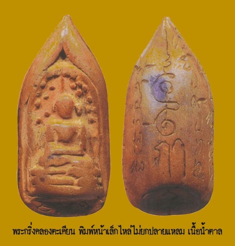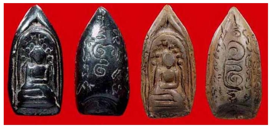 Phra Kring Khlong Takhian: The Buddha image is in the Mara-Vijaya posture, sitting on a high base. Some have three-tiered bases, seated under a Bodhi tree, covered with Bodhi leaves for shade. It resembles the Phra Kong Lamphun, with a high peak and a round, convex face with no details. The back is round and round, and every image has inscribed characters. Some are special because they have the Buddha image on both the front and back, resembling the Phra Kong Lamphun. It is assumed that... they were created by a monk renowned for his magical powers, and that they were created by the same monk, as the handwriting used to inscribe the characters is the same.