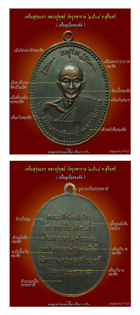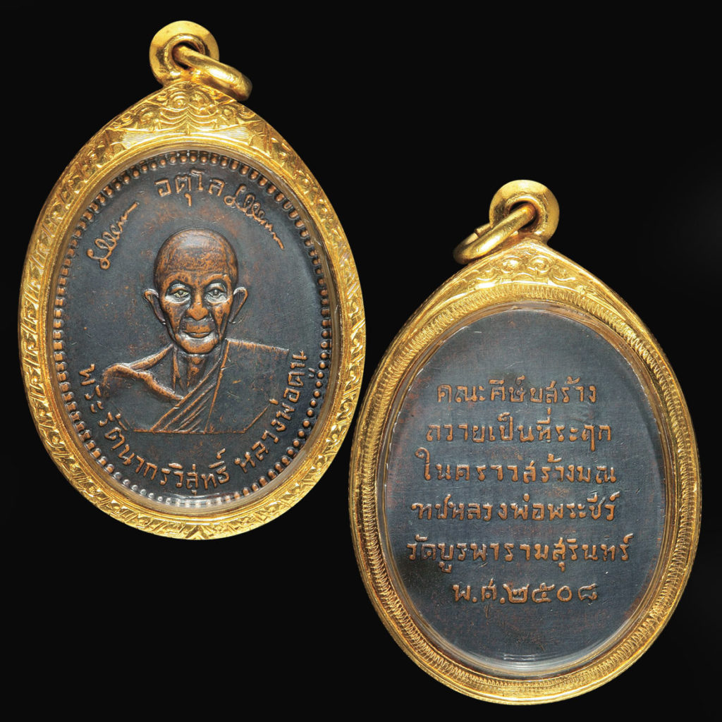 “Phra Rattanakonwisut” or “Luang Pu Dul Atulo” Wat Burapharam, Mueang District, Surin Province, is a Vipassana meditation master of the Isan region who is highly revered. The first edition of the sacred coin was created in 2508 by a group of disciples as a souvenir for the construction of the Luang Pho Phra Chiew pavilion. Only 1,000 coins were created.