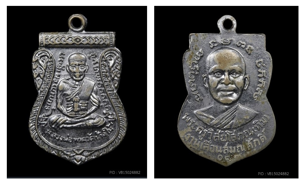 The medallion for promotion in ecclesiastical rank is a sema-shaped medallion. One side has the image of Luang Pu Thuat sitting in meditation with inscriptions around it. There are elephants on both sides. At the base are the words "Luang Pho Thuat, Wat Chang Hai" with a loop inside. On the other side is the image of Luang Pu Tim, half body, front view, with inscriptions around it and the Thai words "Phra Khru Wisai Sophon (Tim)". Ecclesiastical Promotion Ceremony 08