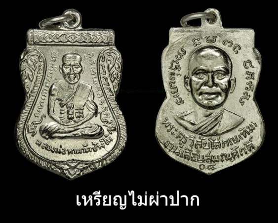 Medallion for promotion in ecclesiastical rank, Luang Por Thuat, Wat Chang Hai, Pattani Province, year 2508. The medallion for promotion in ecclesiastical rank was created in 2508 by Phra Khru Wisai Sophon (Tim Thammatharo), or Ajahn Tim, the former abbot of Wat Chang Hai, on the occasion of being granted a promotion in ecclesiastical rank to Phra Khru Sanyabat, second class, white fan, Vipassana sect (he received a royal certificate to Phra Khru Sanyabat, third class, in 2499, with the name Phra Khru Wisai Sophon).
